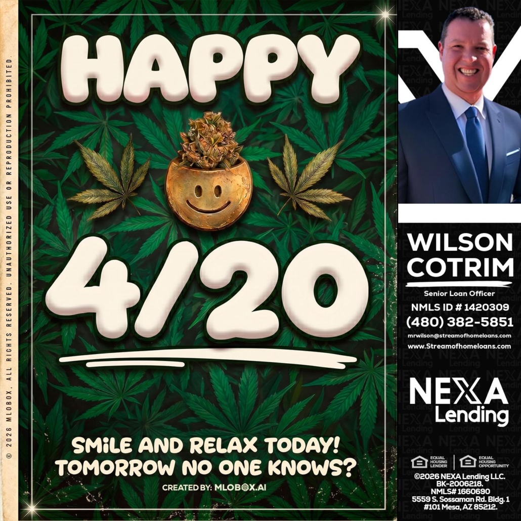 HAPPY 4/20 - Wilson Cotrim -Senior Loan OfficerHi, my name is Wilson Cotrim. I’m a Loan Officer with NEXA Lending LLC., offering personalized mortgage solutions, fast customized quotes, great rates and service with integrity.