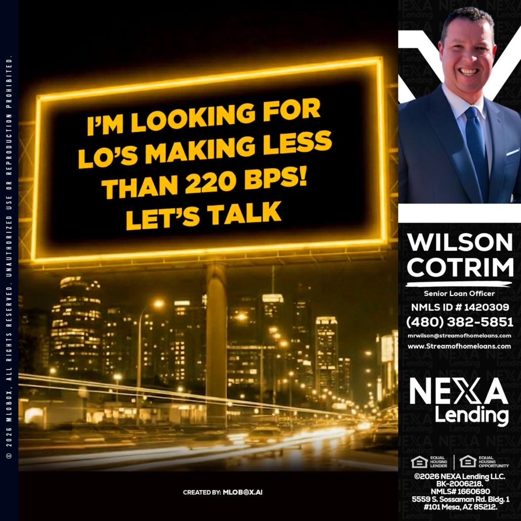 Looking for MLOs - Wilson Cotrim -Senior Loan OfficerHi, my name is Wilson Cotrim. I’m a Loan Officer with NEXA Lending LLC., offering personalized mortgage solutions, fast customized quotes, great rates and service with integrity.