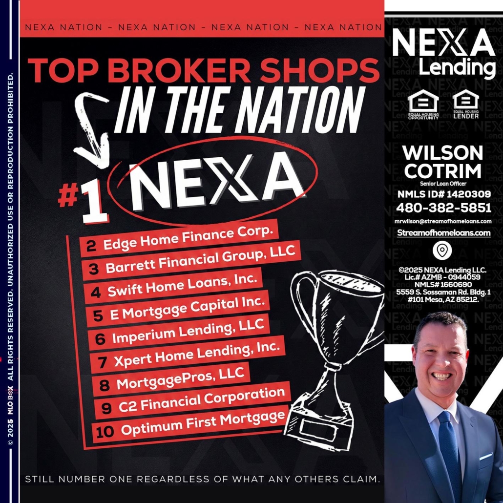 top broker - Wilson Cotrim -Senior Loan OfficerHi, my name is Wilson Cotrim. I’m a Loan Officer with NEXA Lending LLC., offering personalized mortgage solutions, fast customized quotes, great rates and service with integrity.
